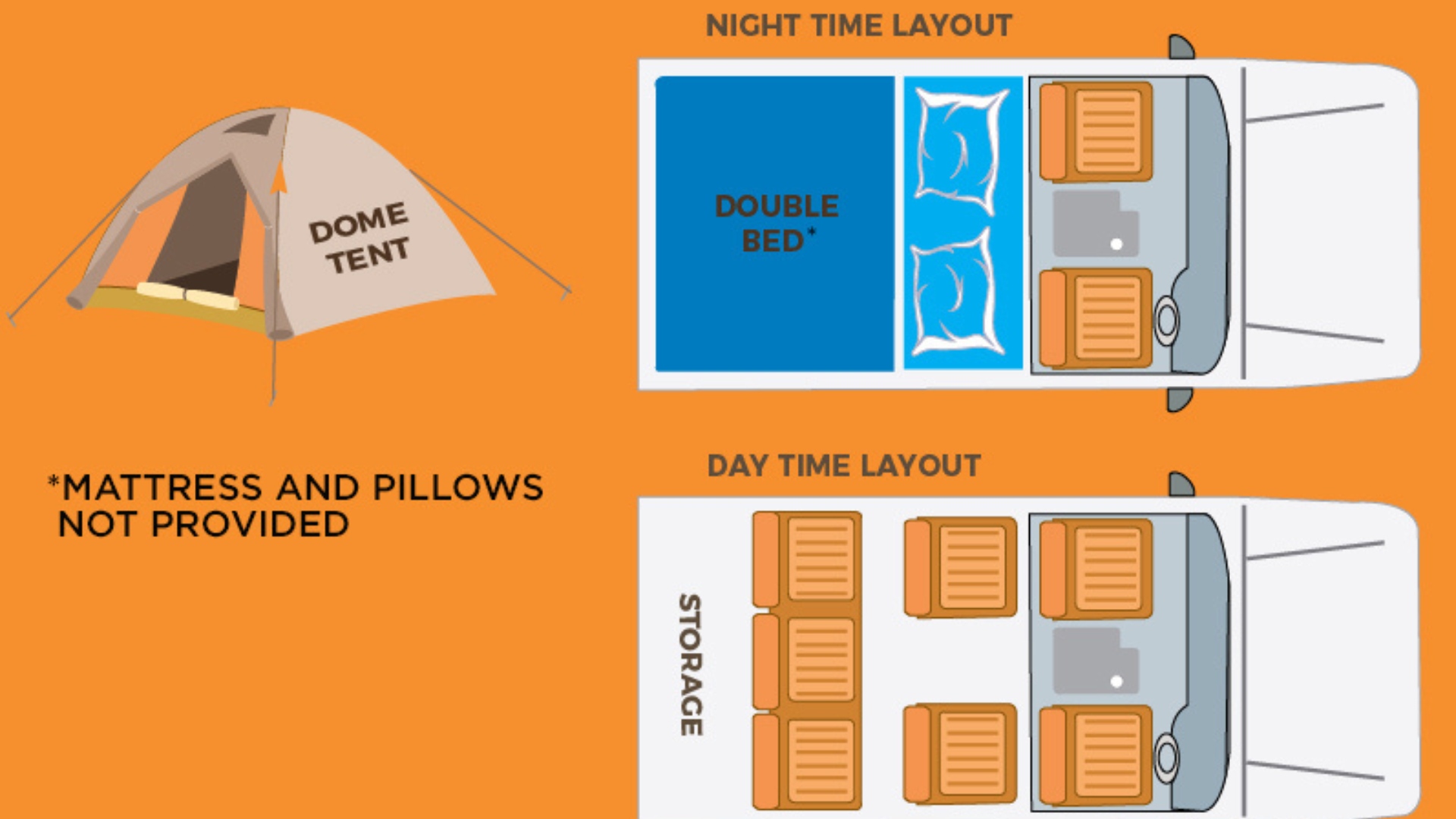 - oder im Fahrzeug schlafen, indem du eine Matratze im hinteren Bereich platzierst (Matratze optional zubuchbar)