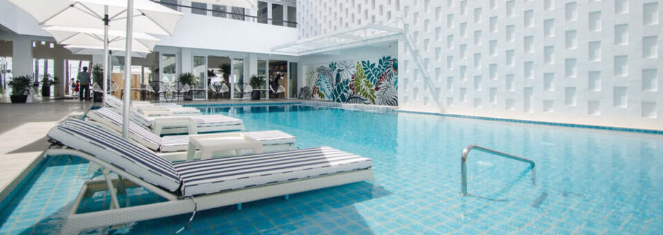 Zimmer: 71 Zimmer mit ansprechend modernem Design. Zur generellen Ausstattung aller Zimmer gehören Klimaanlage, Dusche/WC, Smart-TV mit Netflix-App, WLAN (kostenfrei) und Minibar. Deluxe‑Zimmer: 25 m². Premier‑Zimmer: 25 m². Mit weiteren Annehmlichkeiten. Suite mit 1 Schlafzimmer: 50 m².