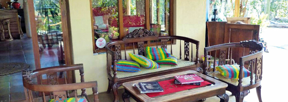 Hotel: Lokale Gerichte werden im Innenbereich oder auf der Veranda serviert. Außerdem: TV, Buch-/DVD-/CD-Verleih, WLAN (kostenfrei), Ayurveda-Massagen und Organisation von Ausflügen.