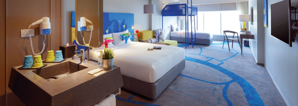 Zimmer: 215 individuell, farbenfroh und belebend eingerichtete Zimmer mit Klimaanlage, Dusche/WC, Föhn, TV, Telefon, WLAN (kostenfrei), Schreibtisch, Minibar/kleiner Kühlschrank, Kaffee-/Teezubereiter und Safe. Standard-Zimmer: Mit 1 Kingsize-Bett oder 2 Einzelbetten verfügbar. Triple-Zimmer: Mit 1 Einzelbett und Etagenbett. Familien-Zimmer: Mit 1 Kingsize-Bett und Etagenbett.