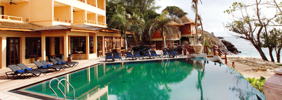 Beliebtes Hotel, an schöner Sandbucht gelegen und eingerahmt von den für die Seychellen typischen Granitfelsen.