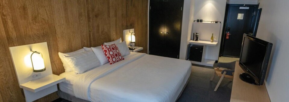 Zimmer: 192. Klimaanlage, Bad/Dusche/WC, Föhn, TV, WLAN, Schreibtisch, Minikühlschrank, Kaffee-/Teezubereiter, Bügelbrett/-eisen und Safe. Teilweise Blick auf die Berge.