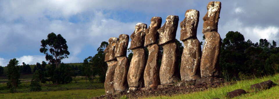 Die Osterinsel zählt zu den isoliertesten Orten der Welt. Mit 4.200 Kilometern Entfernung nach Tahiti und 3.750 Kilometern nach Chile liegt sie mitten im pazifischen Meer und trägt dennoch ihre kulturellen Wurzeln in der polynesischen Kultur. Das einzigartige Rapa Nui, wie die Insel auf Polynesisch heißt, beeindruckt mit rosafarbenen Stränden, grünen Wiesen, Vulkanen und einer vergangenen Kulturgeschichte, die bis heute Forscher vor Rätsel stellt. Auf fast 180 km² sind es besonders die über 1.000 vulkanischen Steingesichter, welche mit offenen Fragen über ihren Sinn und Zweck die Insel an verschiedenen Orten schmücken und prägen. Die riesigen, teils 100 Tonnen schweren Statuen sind alle beinlos und oft fehlt ihnen ein Körper. Mit einem geschlossenen Mund, langen Ohren, einem vorgeschobenen Kinn und einer großen Nase schauen sie alle in das Landesinnere und geben seit Jahrhunderten Raum zum Spekulieren. Bei ihrer Entdeckung durch Jacob Roggeveen stieß der Niederländer auf Spuren einer scheinbar verloren gegangenen Hochkultur, von der selbst die Einwohner von 1722 nichts berichten konnten. Es wird vermutet, dass ein Krieg unter den Stämmen zum plötzlichen Erliegen der Lebensweise führte. Die unter den Ureinwohnern als Moai genannten Statuen wurden möglicherweise zur Ehre verstorbener Vorfahren angefertigt, die daraufhin als Schutzgötter über ihre Stämme wachen sollten. Hierbei dienten wohl auch sogenannte Ahu-Anlagen, auf denen die Moai standen, als Verbindung zur spirituellen Welt. Einerseits wurden dort Opfer für die Götter gebracht und andererseits nutzte man diese Plattformen als Grabanlagen der Häuptlinge. Die Figuren gehören seit 1995 zum UNESCO Weltkulturerbe und sind seit ihrer Entdeckung das beliebteste Ziel auf der Osterinsel.