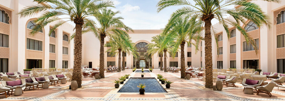 Zimmer: Die 180 Zimmer und Suiten für jeweils 2 Erwachsene mit ansprechendem, arabisch-inspiriertem Interior bieten ein einzigartiges Raumgefühl und allen erdenklichen Komfort. Zur generellen Ausstattung gehören: großzügiges Marmorbad (Wanne und separate Dusche), TV, BOSE®-Lautsprecher, Telefon, WLAN (kostenfrei), Schreibtisch, Minibar, Nespresso®-Kaffeemaschine, Teezubereiter, Safe und möblierte(r) Balkon oder Terrasse. DVD-Spieler sind auf Anfrage erhältlich. Al-Husn-Deluxe-Zimmer: 48 m². Blick auf den Pool oder den Privatstrand. Al-Husn-Deluxe-Zimmer mit Meerblick: 48 m². Al-Husn-Suite (1 Schlafzimmer): 96 m². Meerblick vom Balkon und vom Badezimmer aus. Separates Wohnzimmer mit Sitzgruppe. Butler-Service auf Anfrage.