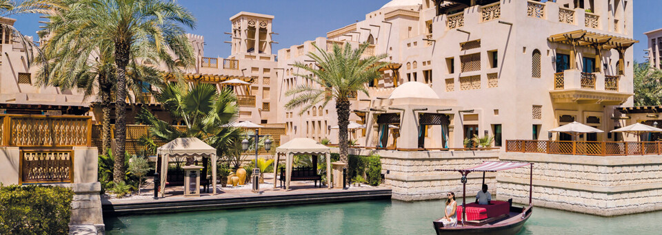 „Die Stadt Jumeirah“ garantiert ein wahrhaft magisches Urlaubserlebnis. Die im Stil einer arabischen Zitadelle errichteten Gebäude dieses luxuriösen Resorts vereinen traditionelle Schönheit mit modernen Annehmlichkeiten. Die traumhafte Anlage ist mit 3 km langen Wasserwegen durchzogen, die mit schwimmenden Taxen in Form von traditionellen arabischen Abras befahren werden, sodass man problemlos alle Ziele innerhalb des Resorts erreichen kann.