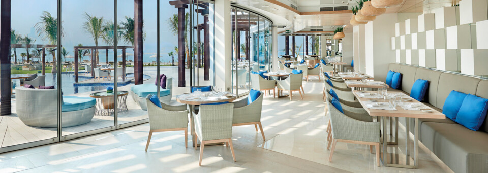 Das exzellente Resort schmiegt sich wie eine weiße Perle an die Küste des Arabischen Golfs.