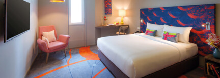 Modernes Hotel im Herzen der belebten Khaosan Road, wo sich Essensstände, Souvenirshops, Restaurants und Bars aneinanderreihen.